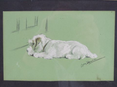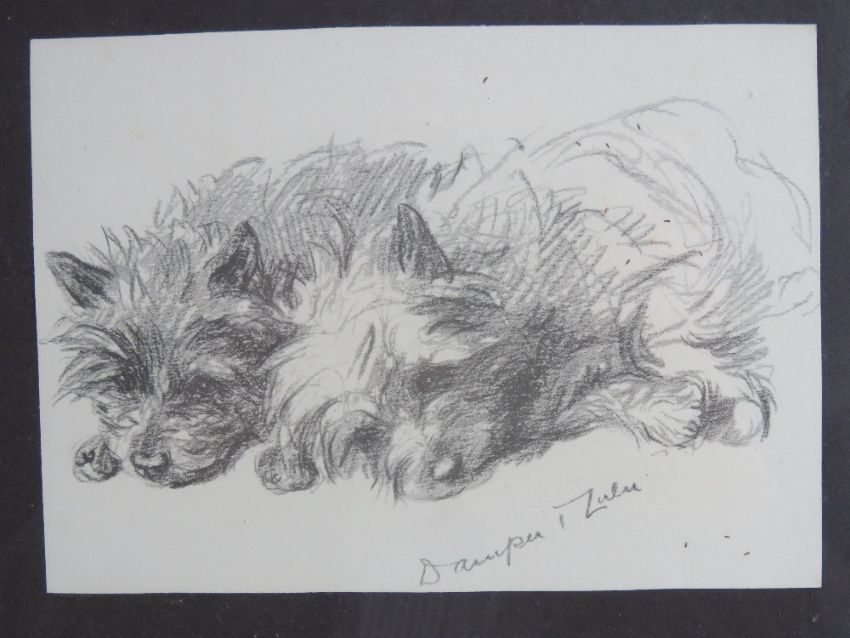 A montage of sketches and prints featuring soppy eyed dogs, frame measuring 61 x 42cm.