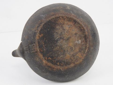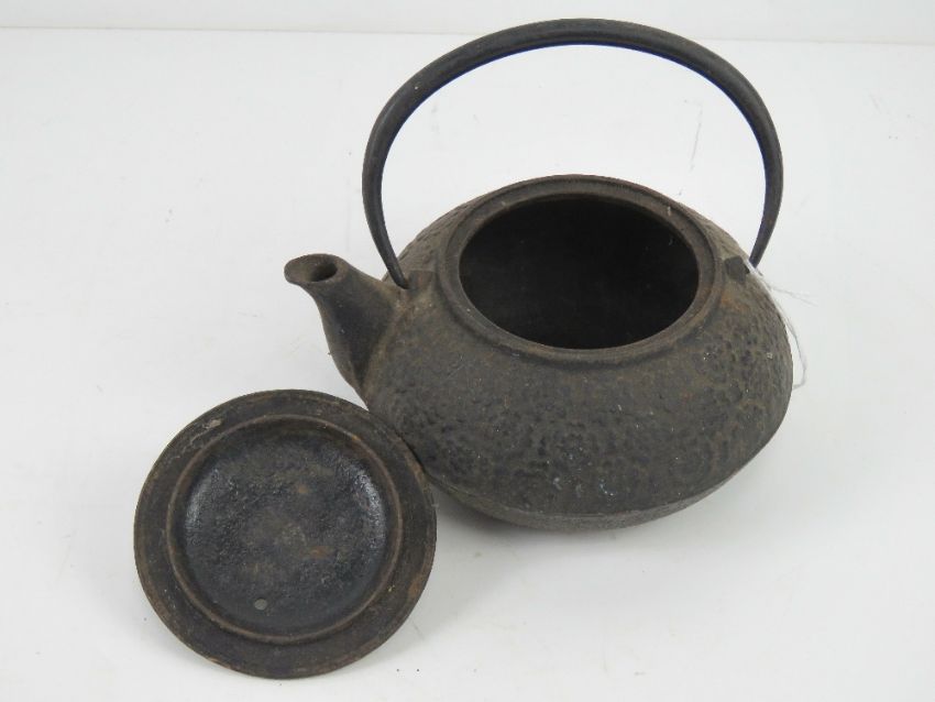 An oriental cast iron teapot having raised floral decoration upon, swing handle, oriental marks to base, approx 14cm dia, approx 15.5cm high.