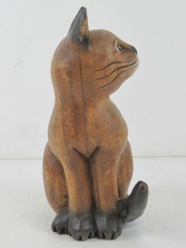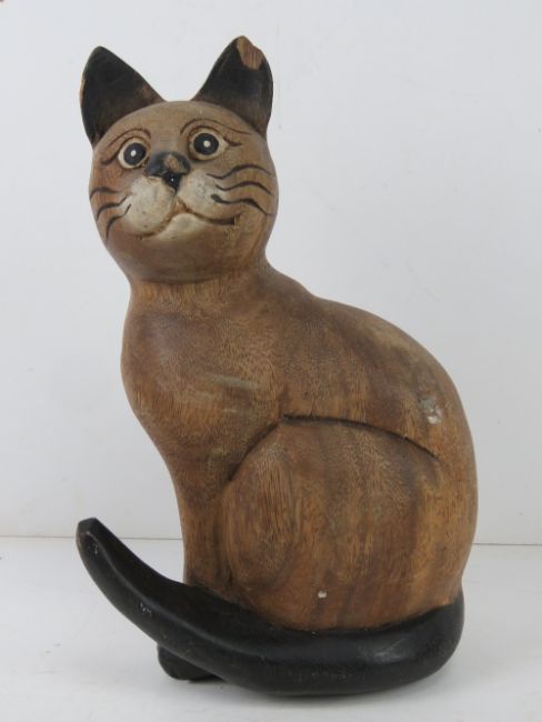 A carved and painted wooden figurine of a cat, one ear slightly a/f, 28cm high.