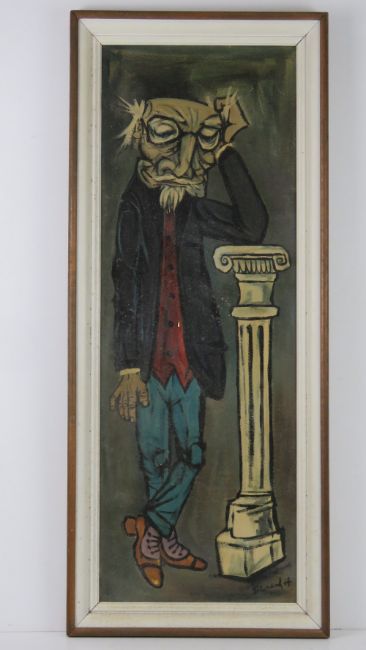 An original painting of a elderly gentleman leaning against a column plinth, signed indistinctly lower right, framed 88 x 37cm.