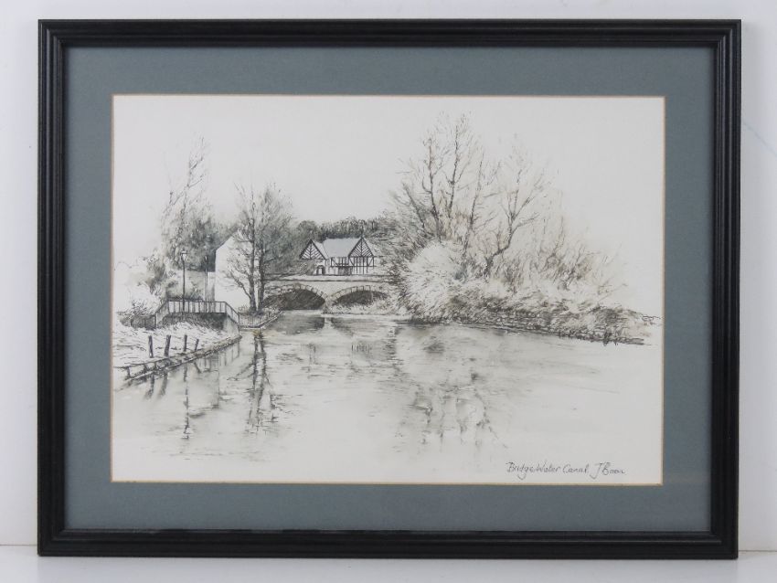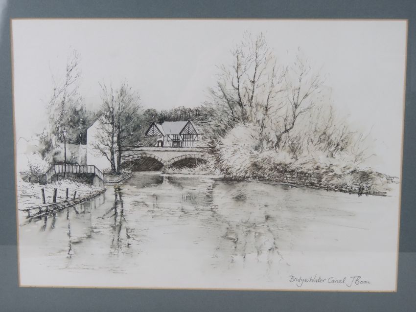 A watercolour and ink sketch of Bridgewater Canal signed J Boon, sight size 38 x 26.5cm, framed and mounted.