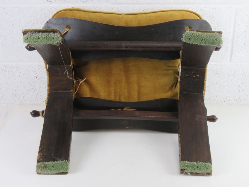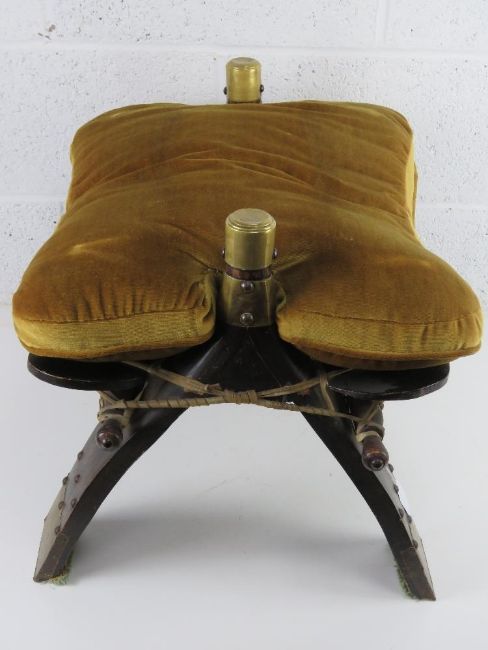 A c1970s camel saddle stool having brass fittings and golden velvet cushion.