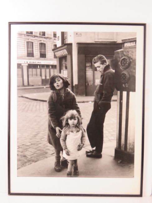 Photographic print; three children posing on French street, framed and glazed, overall 73.5 x 28cm.