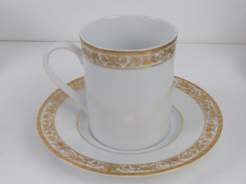 A set of twelve contemporary cream ground and gilded coffee mugs and saucers.