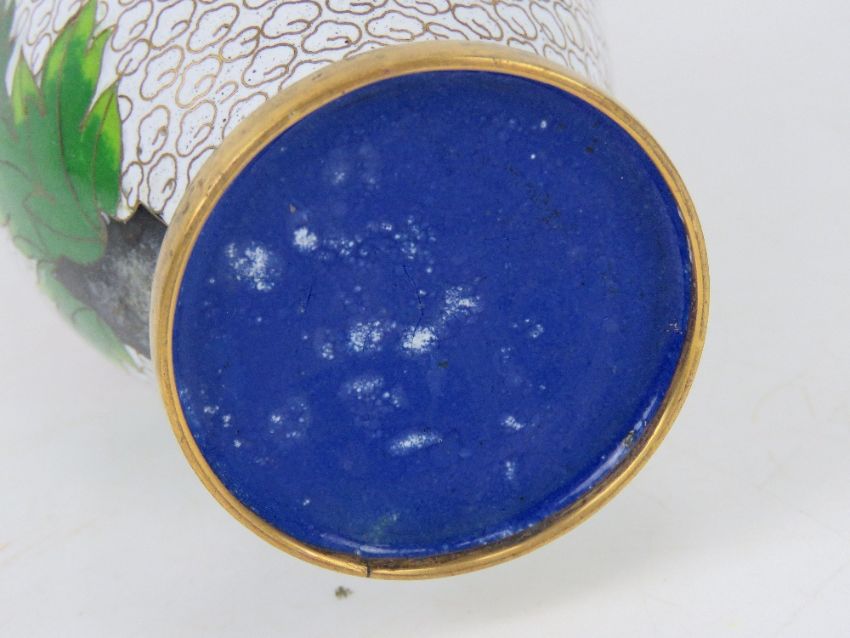 An early 20thC Chinese cloisonné Canton enamel vase, white ground having pink floral pattern upon, 18cm high.
