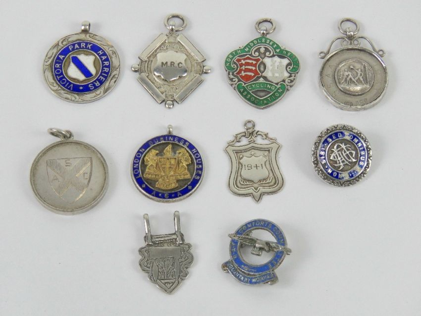 A quantity of HM silver sporting medallions together with three white metal medallions, an HM silver and enamel badge and an RAF Voluntary Worker badge. Ten items.
