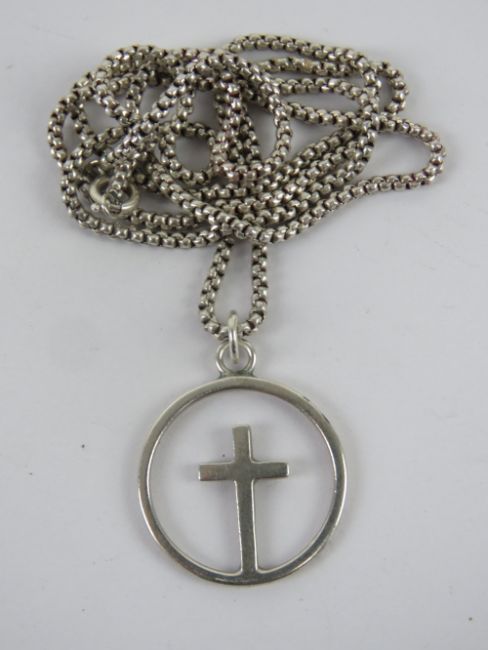A silver crucifix pendant having cross within open hoop, stamped sil, on chain marked Sterling, 2.3cm dia, 9.1g.