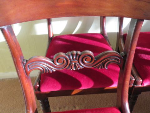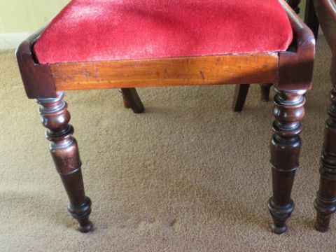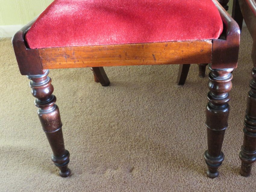 A set of six (4 +2) mahogany bar back dining chairs having red velvet drop in seats, ring turned legs, all c1880s.
