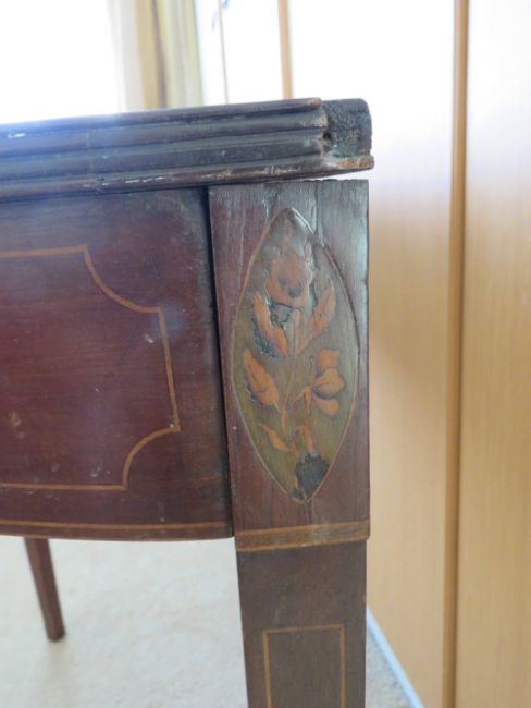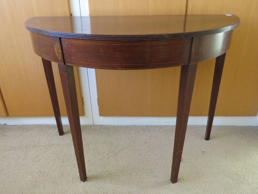 Ad Edwardian mahogany demi-lune table raised over square tapering legs, measuring 96 x 47 x 70cm.