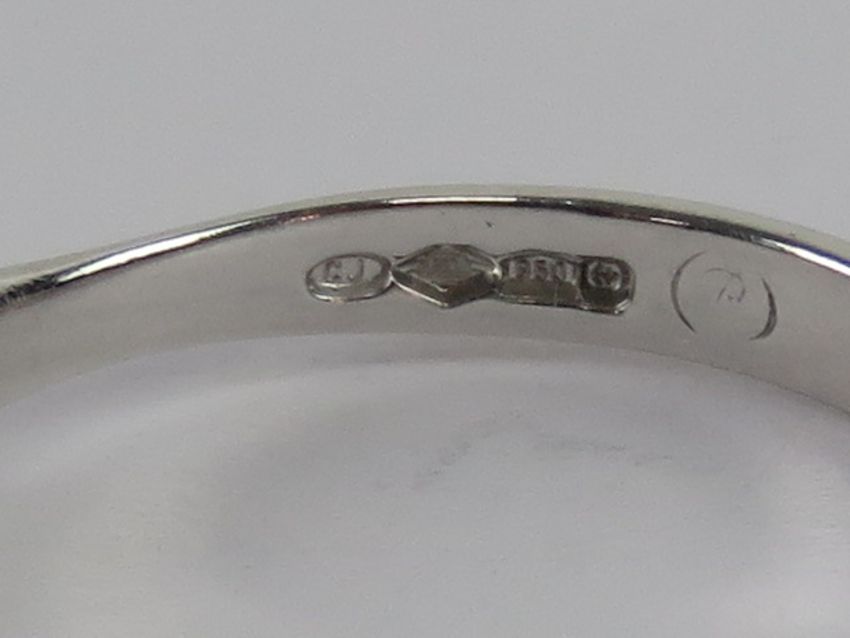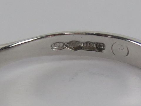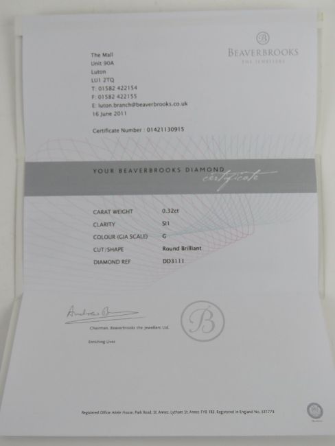 A platinum and diamond solitaire ring with certificate, the round cut brilliant diamond in claw setting (Beaverbrooks cert details; 0.32ct, SI1 clarity, G colour), hallmarked 950, size N-O, 3.6g.