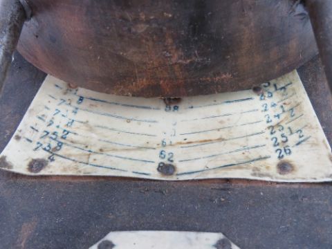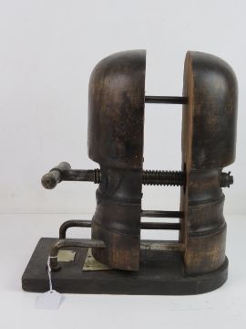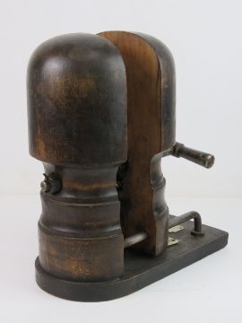 Milliner's / Hatshop toolA circa 1910 ebonised fully working Beech and Pine counter top Hat Shop size adjuster ( with Steel thread , runners and handle) with marked ivorine hat sizes and retailers plaque ( worn), very similiar to a Farr Brothers of Luton. Originally came from a house clearance in Luton.Measures 12 inches long x 13 1/2 high x 6 1/2 inches wide ( 30.48 x 34.29 x 16.5 cm)