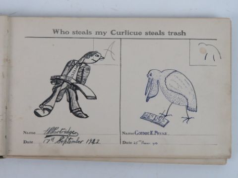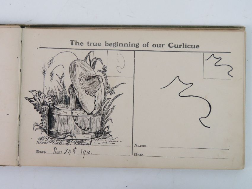 Book; 'Curlicues, Curlicue and Come Again' c1910, cloth full bound, in which the frontis piece is thus 'Directions in drawing a curlicue the artist may use one of the lines that are already printed in the book for the purpose. Or the Curlicue maker may drawer a fanciful line suggesting some type of face figure or animal that can be completed by the addition of a few lines or marks.' The book goes on to contain a number of drawings, cartoons etc by various artists. An interesting novelty book of the era.