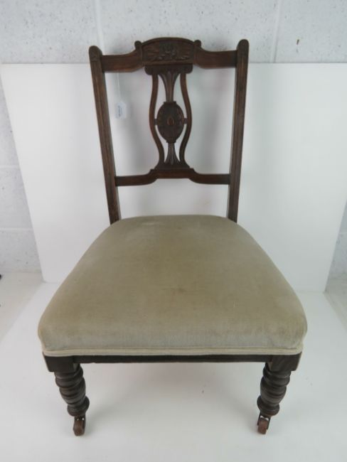 A single Victorian low fireside chair raised over turned legs ending in ceramic castors.