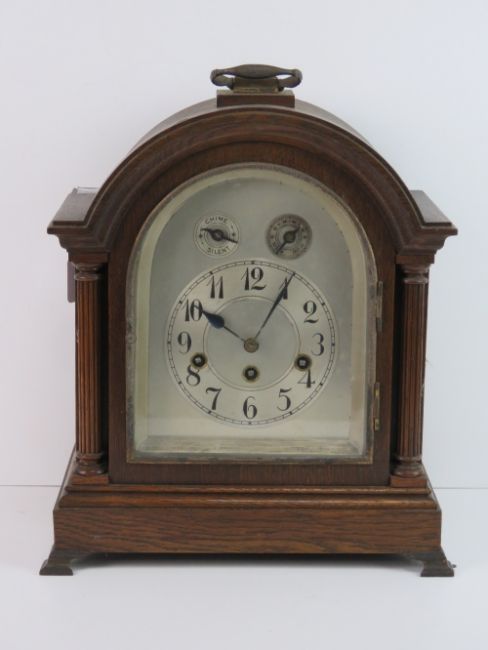 A late Victorian oak cased dome top table clock, silvered arch top dial with Arabic numerals, subsidiary chime/silent dial and slow/fast dial, all before the clockwork movement, three train movement striking on five straight gongs, with key and top handle, all standing 36cm high.