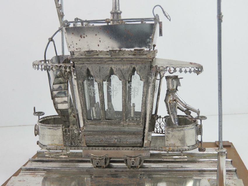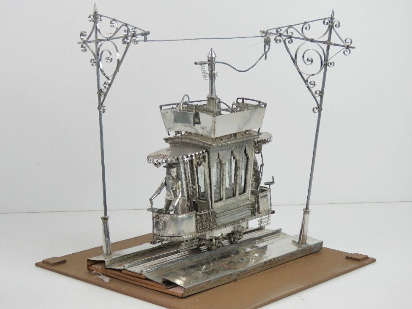 A hand made tin model tram car complete with driver and pantograph, having glazed windows, within glazed display box. Box 26 x 26 x 29cm.