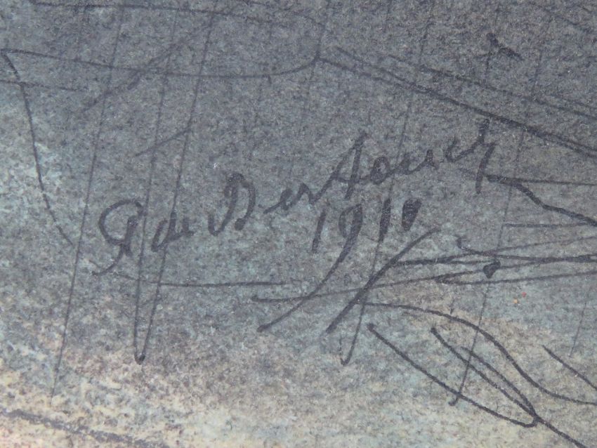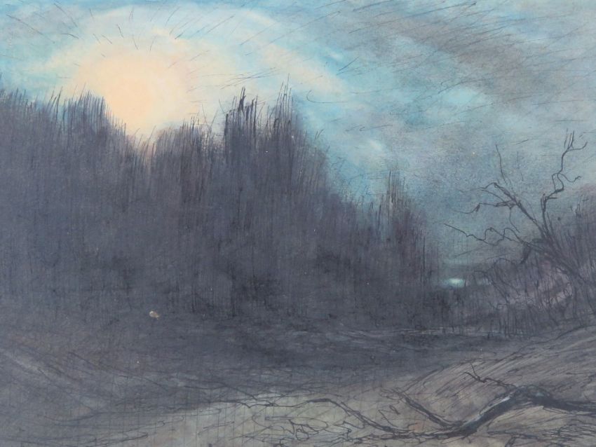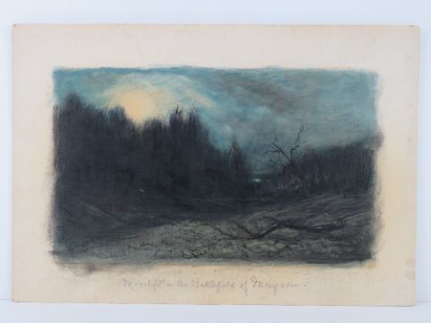 R di Bertouce (?) 1918 World War One Expressionism Pen ink, pencil and Watercolour ' Moonlight in the Battlefield of Margsee' , a WW1 Battlefield ( thought to be France / Belgium border) with sun rising over the woods. Signed and dated 1918 lower left, titled under with words verso. Image 8 7/8 x 14 5/8”( 25.1 x 37.1 cm)