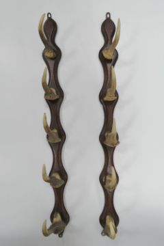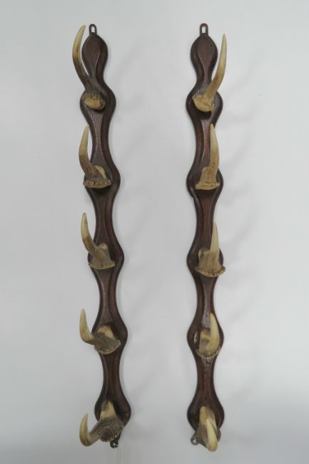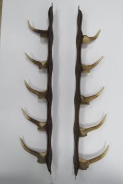 A pair of oak and muntjack antler hanging racks, each measuring 75cm in length.
