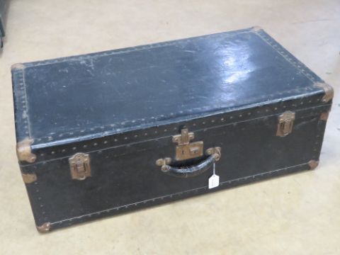 A black painted trunk having stud work and corner bracing, leather end handles, 84 x 47 x 28cm.