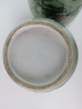 Pair of Celadon Glaze and enamels Oriental vases- Each Chinese vase having a blue sparrow like bird amongst rose flowers and foliage,10 3/8 in high