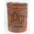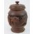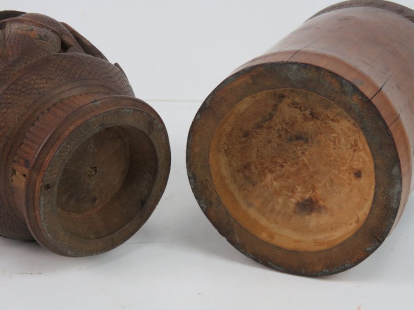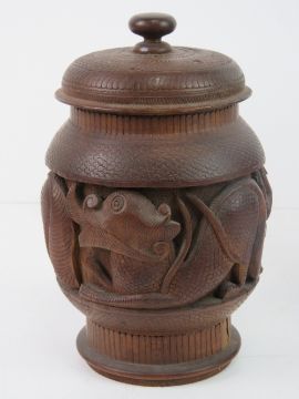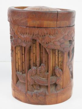 19 thC Japanese bamboo brush pot and another; an oriental carved and lidded circular pot showing figures in a bamboo forest, approximately 4 ½ in diameter and 6 in high, a carved and lidded oriental hardwood bellied pot, possibly a tobacco pot, with diaper borders and Dogs of Fo middle section 7 i9n high x 4 ½ in diameter