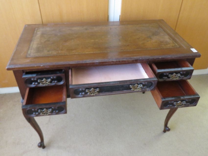 A late 19th/early 20thC escritoire writing desk. Tooled leather writing service over central drawer, flanked by twin drawers to each side and raised over shaped legs, measuring 99 x 52 x 72cm.