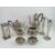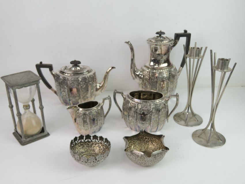 A silver plated four-piece tea service. Together with a pair of candlesticks, an Italian sand timer and two Persian style white metal bowls.