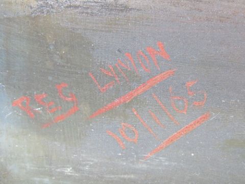 Oil on board, a riverside farm with trees beyond and double arch stone bridge. Signed lower left Reg Lymon and dated 10/1/65.Sight size 90 x 77cm, framed.