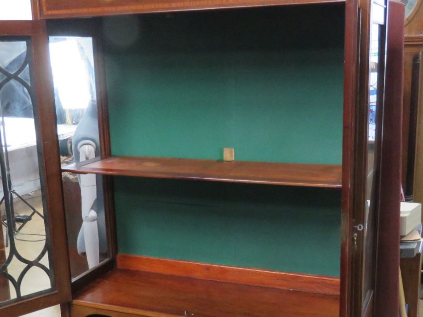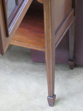 A good Edwardian two door display cabinet strung and cross banded mahogany, twin astral glazed doors opening to reveal shelves within, raised over square tapering strung legs united by an under shelf, 106cm wide, 171cm high, 41cm deep.