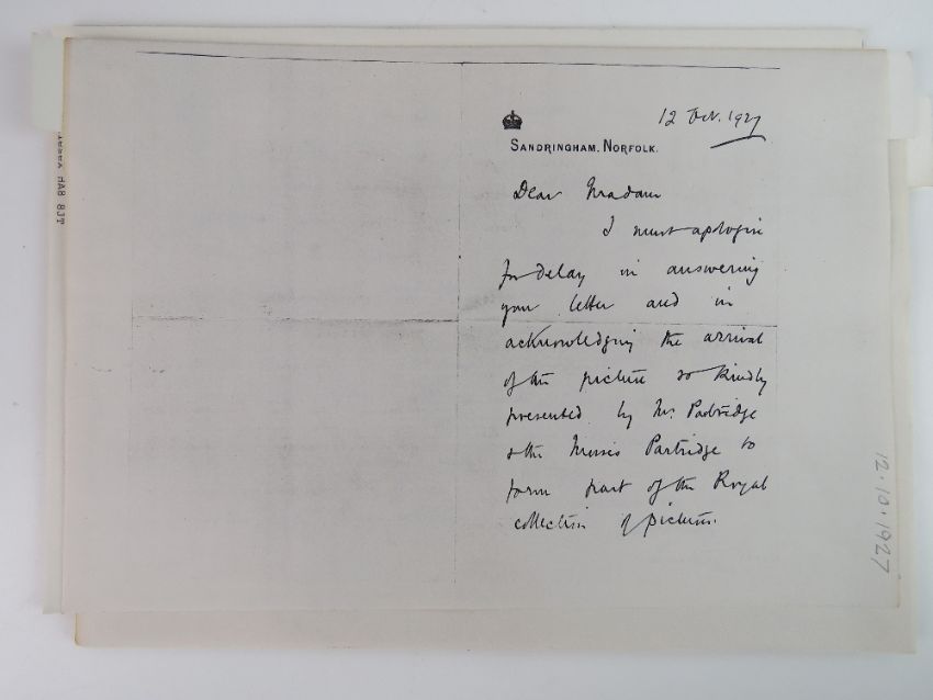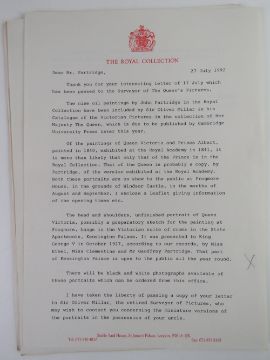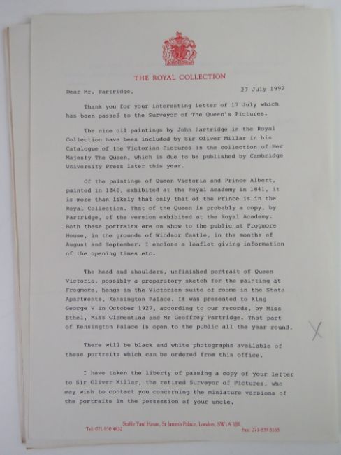 John Partridge (British 1790-1872); a pair of artist preparatory oil studies of H.M Queen Victoria and H.R.H Prince Albert, having been held by the artists family (copy of family tree provided - the artist being the brother of the vendors Great, Great, Great Grandfather) with letters from The Royal Collection dated 1992 noting that the details of the paintings would be added to their records of John Partridges work for the Royal Family.Each oil on bard is an unsigned full length study on board impressed 'Brown Holborn' verso. Sight size 9" x 6 1/2" (23 x 16cm). Each in arch top later painted frame 14" x 11" (36 x 28cm). The Queen, in a black evening dress with a black and silver head-dress, wears the ribbon and star of the Garter and the Garter round her left arm. She stands with her hand resting on a letter on the table. The gilt metal inkstand set with semi-precious stones was a present from Prince Albert to the Queen on her birthday, 24 May 1840. The bracelet on her right arm is set with a miniature portrait of Prince Albert by Sir William Ross for which the Prince had sat in February and March 1840 and the locket round her neck was given to her by Prince Albert.Prince Albert wears the uniform of the 11th Hussars with the ribbon and star of the Garter, the badge of a Grand Cross (Military) of the Order of the Bath and the badge of the Golden Fleece. He rests his hand on his sword and holds his shako which, from 1800 onwards became a common military head-dress in most armies. In this oil he holds the reigns of his horse - the horse was removed from the final painting.Condition: a/f, probably over varnished at some stage causing shrinkage/crazing.The original final portraits were exhibited at the Royal Academy in 1841. A copy by Partridge of the Queen Victoria portrait and the original Prince Albert portrait now hang in the Duchess of Kent's Sitting Room, Frogmore House.Included in the lot are two copies of letters dated 1927; one from Balmoral "Her Majesty thinks it most extremely kind of Mr & the Misses Partridge to wish to give their valuable portrait of Queen Victoria to the King" possibly referencing the copy portrait by Partridge now hanging in Frogmore House, the other letter being from Sandringham acknowledging the arrival of the picture.