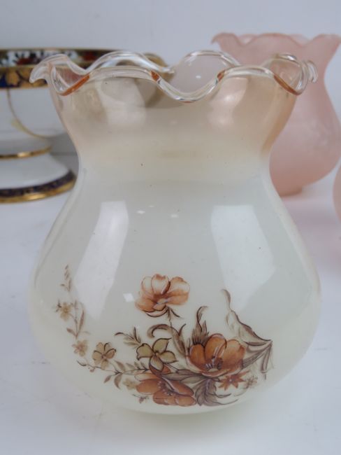 A hand painted Myott Son & Co hors d'oeuvres dish together with three glass table lampshades, a green glass goblet and a pedestal bowl (a/f). Six items.