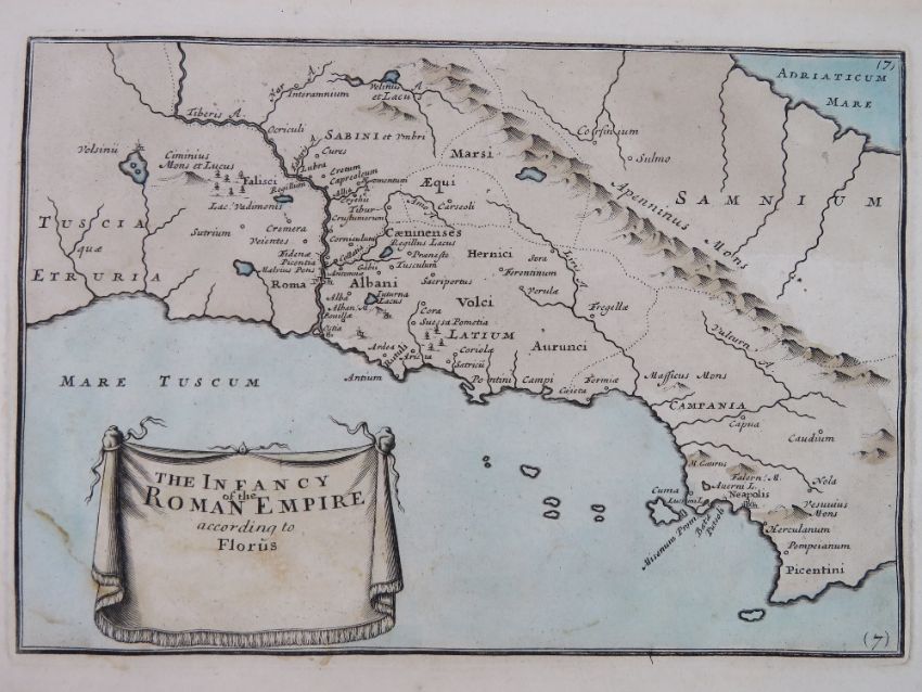 C. 1732 Map-' The Infancy of the Roman Empire according to Florus ' a hand coloured map by Herman Moll, of part of Italy, naming Roma, Albani, Neapolis, Pacentini etc. Plate 6 3/8 x 9 1/4 inches ( 16.19 x 23.49 cm) Herman Moll ( 1678-1732) Moll was a Dutch emigre who came to London about 1680 following the Scanian Wars, he first worked as an engraver for Moses Pitt, later setting up his own business and becoming, after the turn of the century, the foremost map publisher in England. As his fame grew he became a well known figure at in the group of Intelligencia who gathered at Jonathon's Coffee House in Exchange Alley or Change Alley. This narrow alleyway connecting shops and coffeehouses in an old neighbourhood of the City of London, served as a convenient shortcut from the Royal Exchange on Cornhill to the Post Office on Lombard Street. Shops once located in Exchange Alley included ship chandlers, makers of navigation instruments such as telescopes, and goldsmiths from Lombardy in Italy. The coffee houses of Exchange Alley, especially Jonathan's and Garraway's, became an early venue for the lively trading of shares and commodities. Moll was able to obtain crucial information from the lively commercial and intellectual scene in the area. Moll was at the forefront of map making during his working life and his maps reflect his ever inquisitive nature.