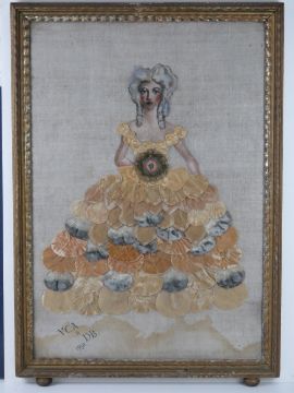 A large gilded framed cloth depiction of Georgian fine lady. The dress being made from multiple velvet 'oysters' and printed lower left 'V C A & B B 1930'. measuring 69 x 54cm within earlier good gilt frame.