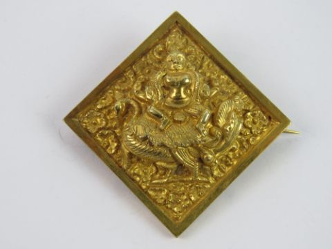 A late 19th / early 20th century Tibetan brooch in untested gilt metal, featuring Mahamayuri sat on a peacock, 5cm wide, 11.9g.