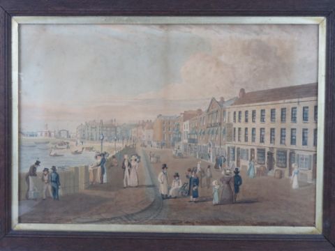 A fine pair of coloured prints possibly being Eastbourne beachfront in the mid 19thC, each within period oak frames and measuring 38 x 54cm. Unsigned.