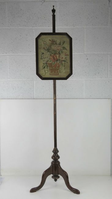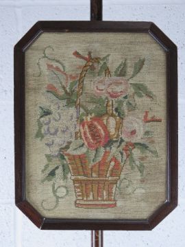 A vintage tapestry pole fire screen having floral basket in glazed octagonal frame, frame 28 x 36cm, overall height 44.5cm.