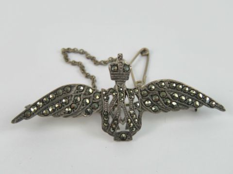 A silver and marcasite RAF 'wings' brooch.
