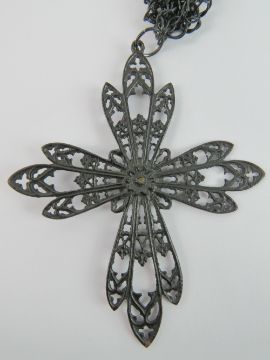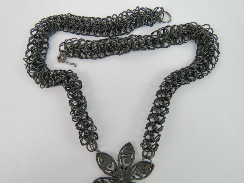 A 19th century Berlin Iron necklace bearing Gothic arched cross with profile over, on Berlin Iron chain with floral motif, the cross measuring 8.5cm in length, clasp a/f.