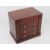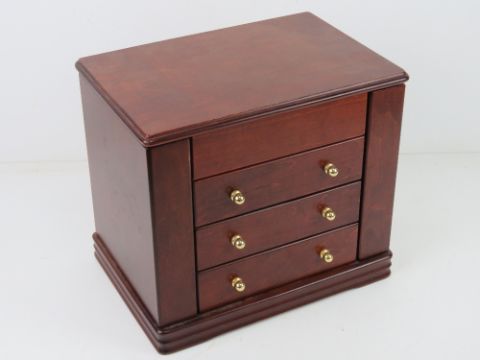 A contemporary jewellery box, lid lifting to reveal mirror having hanging compartments to each side and three central drawers.