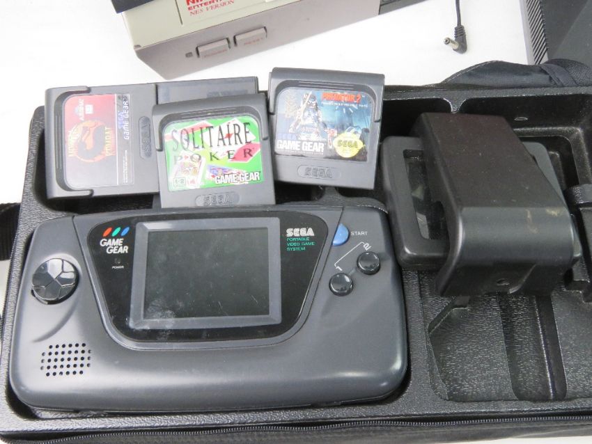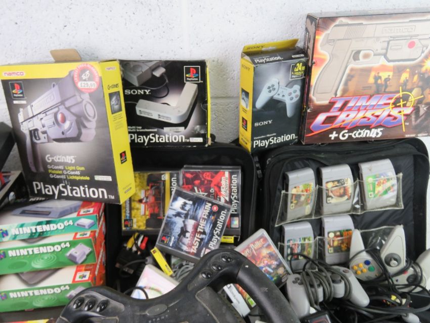 A large collection of video game consoles including two Sega Mega Drive, Playstation, Xbox, Nintendo 64, Gameboy (powers on - untested) various wires and controllers, some original boxes and carry bags. All untested.