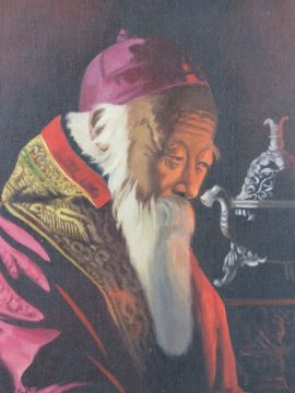 Oil on canvas of a Chinese gentleman in embroidered robe, indistinct signature, 44 x 54.5cm, framed.