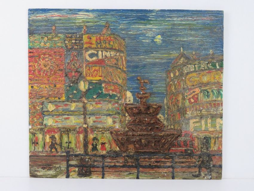 David Martin XX Social History Heavy Oil on board Piccadilly Circus with statue of Eros before the large electric light advertising Billboards ( before the redevelopment ) Signed and dated lower left 14 1/2 x 16 1/2 ins ( 36.7 x 41.8 cm)