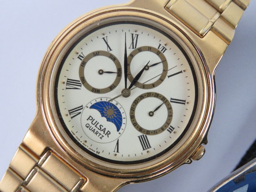 A Pulsar by Seiko V33F-7000 Men's sun/moon phase wristwatch with original strap. Together with a Davidoff Cool Water wristwatch. Two items.