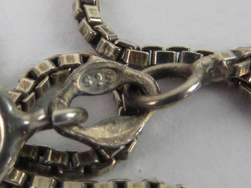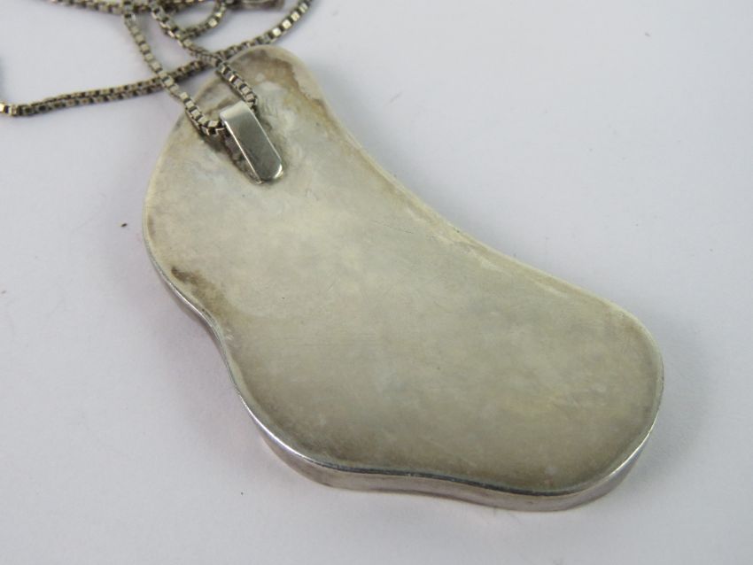 1960's Danish style Modernist jewellery; a large pink druzy agate slice set in handmade white metal pendant mount, on 925 silver box link chain. Pendant approx 5.5cm in length.