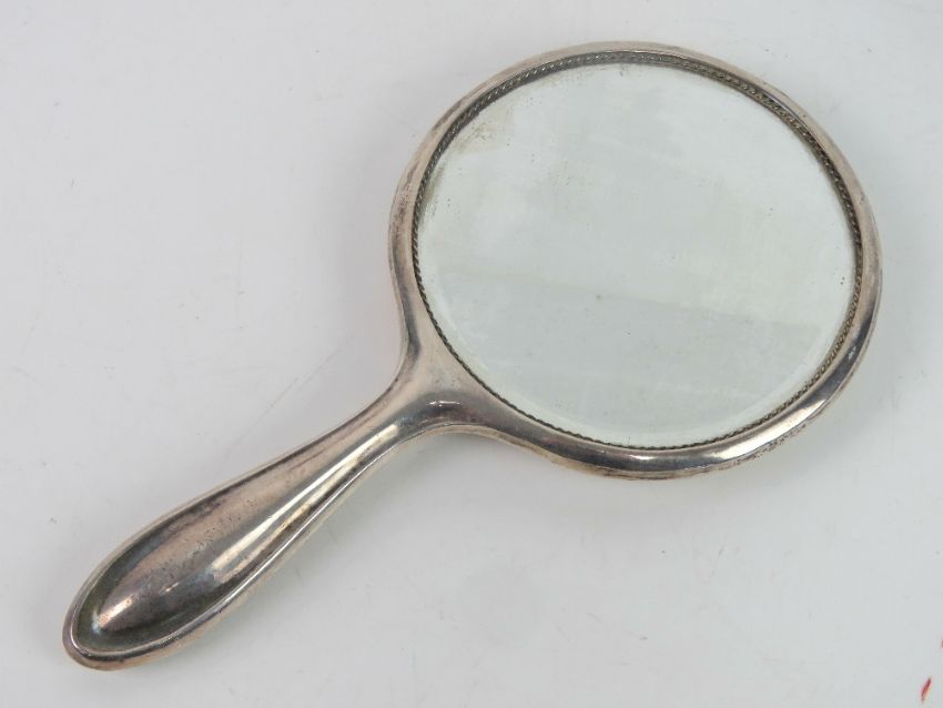 A HM silver dressing table hand mirror, hallmarked for Birmingham.