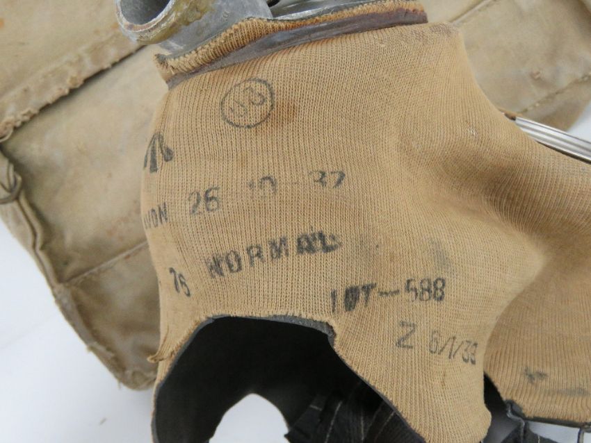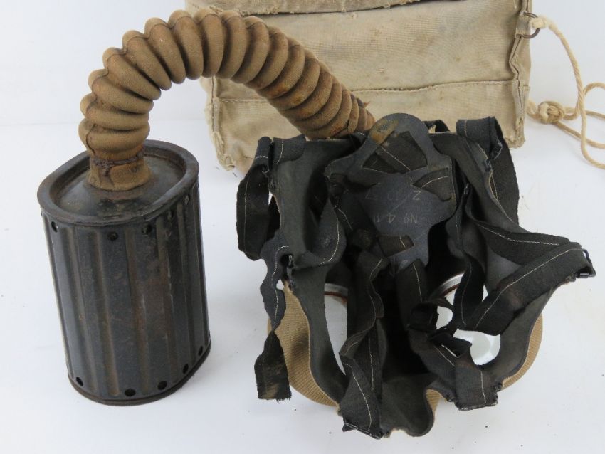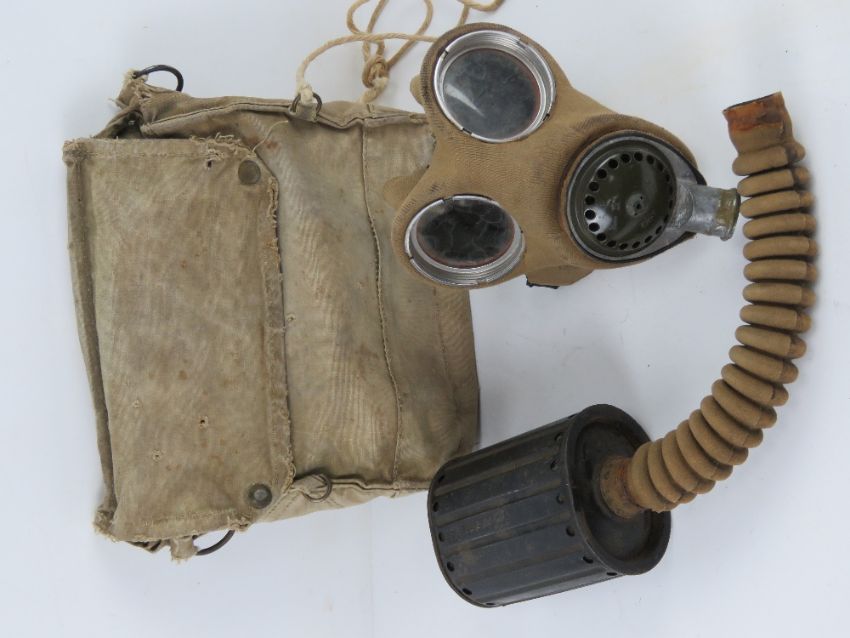 A WWII British rare filtered service gas mask and bag with eye glasses (extremely rare filter, these filters were very expensive to produce so only a very small amount were ever made.)