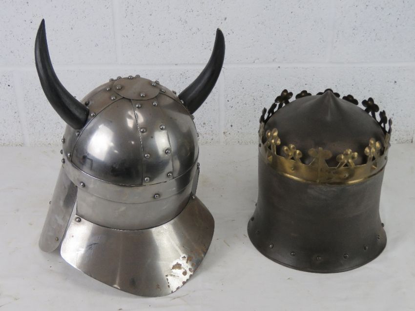 Two Medieval style re-enactors helmets.