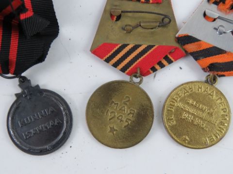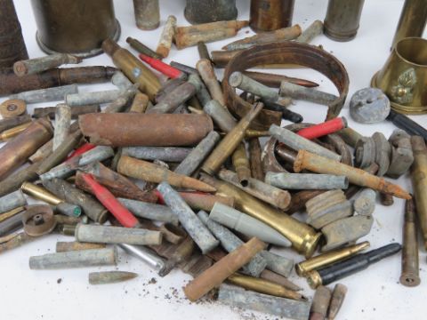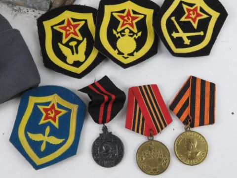 A quantity of assorted inert ammunition, assorted brass shell cases, four Russian patches, three Russian medals, two Russian badges and one Russian Side cap.
