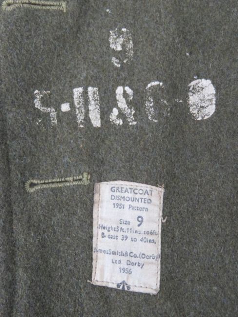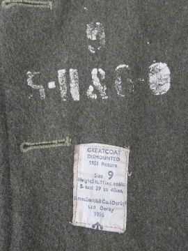 A British Army Great coat dated 1951, badged to REME, size 9.