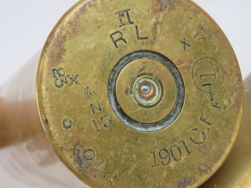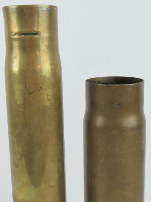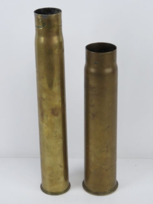 A brass British shell case dated 1901 and measuring 31cm high, together with another dated 1918 and measuring 38cm high. Two items.