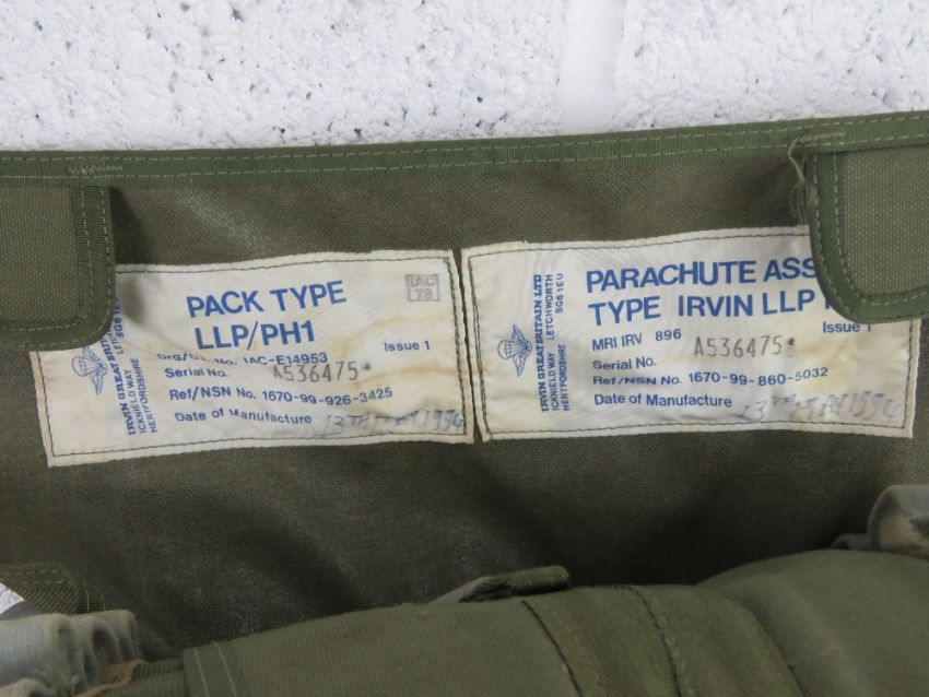 Two British Military parachute regiment training parachutes, one being a main training pack and the other is a reserve training pack, Irvin made.